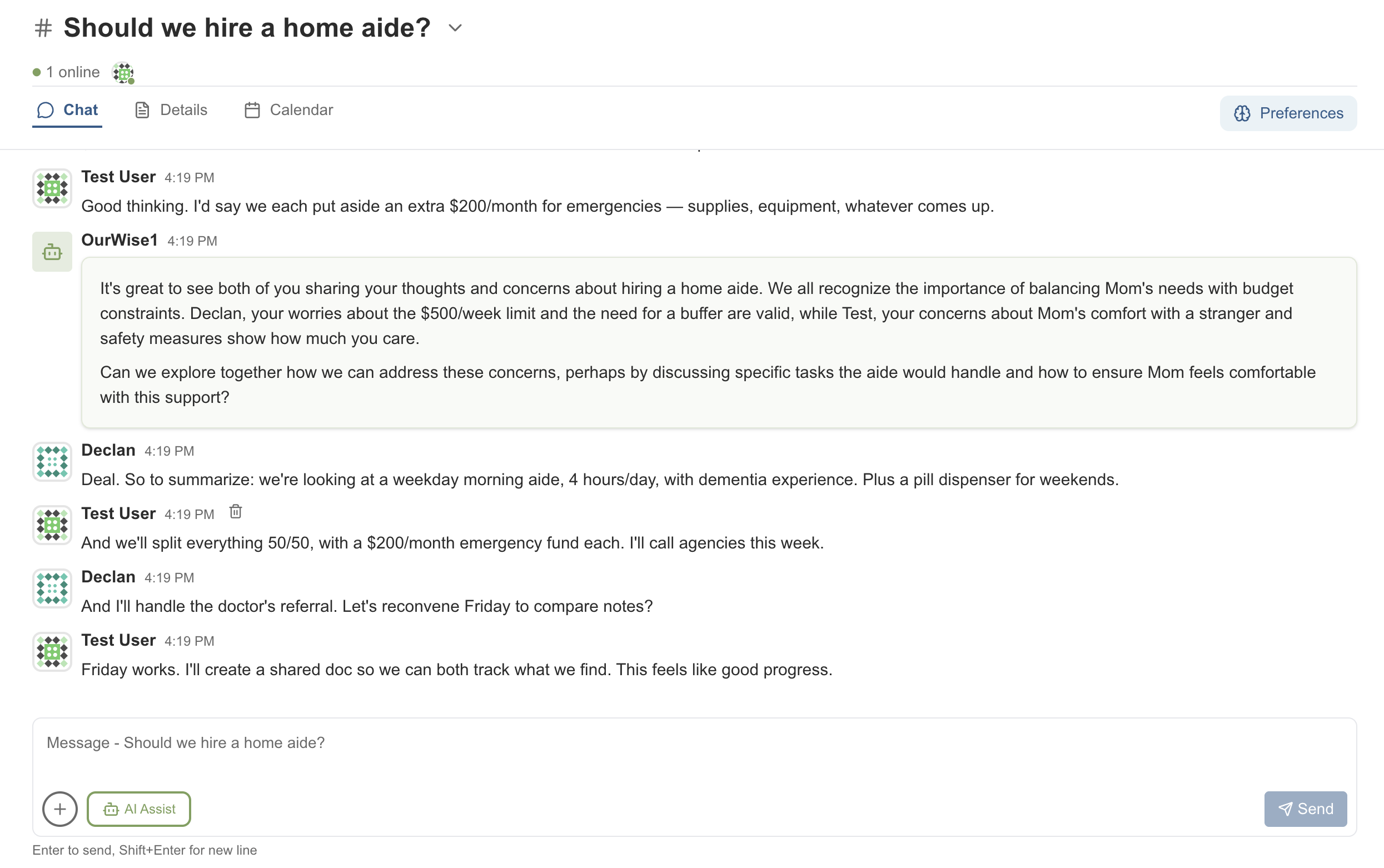We have five siblings spread across three states. Every conversation about Mom's care turned into an argument because everyone had different information and different priorities. This platform gave us a way to actually hear each other and make decisions we could all live with.
