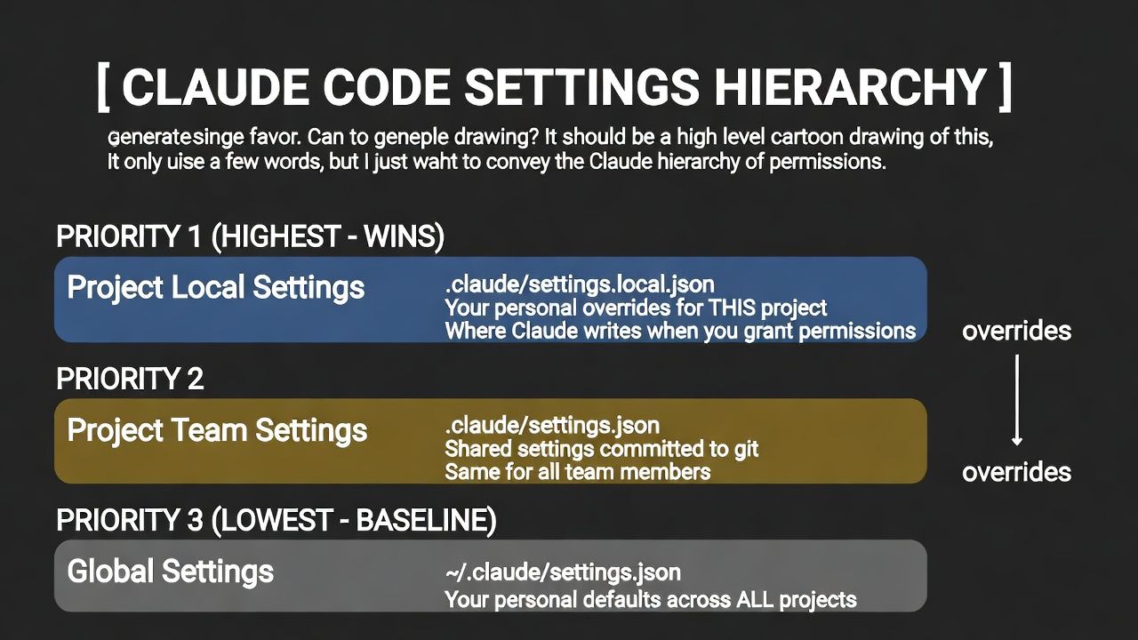 If you want to have Claude not stop you every three seconds, asking you a million questions if you want to do this or that, this is how you set up your permissions. That you understand what the hierarchy is, and that your local always wins. This is the key one.
